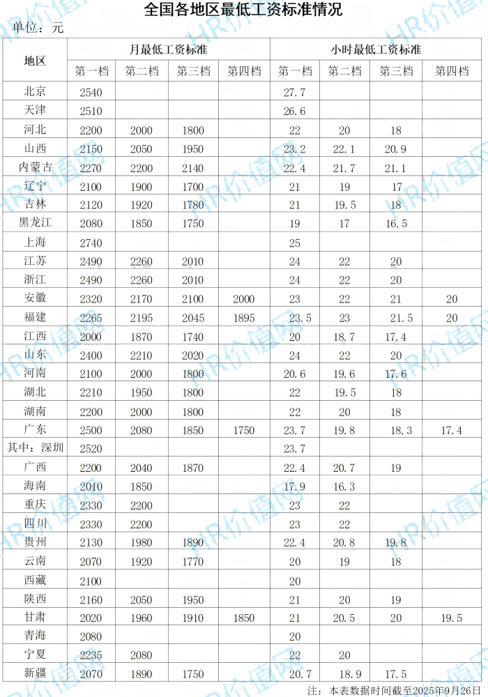 发布于:安徽省 近日,山东省人民政府关于公布全省最低工资标准的通知,通知明确调整后的全省月最低工资标准按区域分为三档,依次为2400元、2210元、2020元;小时最低工资标准依次为24元、22元、20元。调整后的最低工资标准从2025年10月1日起执行。 日前,宁夏自治区人民政府关于调整全区最低工资标准的通知,我区从2025年10月1日起调整最低工资标准,月最低工资标准一类区提高到2235元,二类区提高到2080元;非全日制就业劳动者小时最低工资标准一类区提高到22元,二类区提高到20元。 9月16日,安徽省人民政府发布通知,调整安徽省最低工资标准。 根据有关法律法规规定,结合安徽省经济社会发展状况,经安徽省政府同意,自2025年9月1日起调整全省最低工资标准,月最低工资标准第一档至第四档分别为2320元、2170元、2100元、2000元;非全日制小时最低工资标准第一档至第四档分别为23元、22元、21元、20元。 天津市人力资源和社会保障局网站近日发布关于调整天津市最低工资标准的通知:经市人民政府批准,决定调整本市最低工资标准,月最低工资标准由2320元调整为2510元。非全日制用工的最低小时工资标准由24.4元调整为26.6元。本通知自2025年9月1日起执行。 日前,湖南省人社厅印发《关于调整2025年最低工资标准的通知》,我省月最低工资标准(适用于全日制劳动者)档次调整为:2200元/月、2000元/月、1800元/月;我省小时最低工资标准(适用于非全日制劳动者)档次调整为:22元/小时、20元/小时、18元/小时。我省最低工资标准包括劳动者个人应缴纳的各种社会保险费,该标准从2025年9月1日开始执行。 7月24日,北京市人力资源和社会保障局宣布,自2025年9月1日起,本市调整最低工资标准。月最低工资标准由每月2420元调整为2540元,非全日制从业人员小时最低工资标准由每小时26.4元调整为27.7元。 最低工资标准一般采取月最低工资标准和小时最低工资标准的形式,月最低工资标准适用于全日制就业劳动者,小时最低工资标准适用于非全日制就业劳动者。按照人社部2004年发布的《最低工资规定》,省、自治区、直辖市范围内的不同行政区域可以有不同的最低工资标准,最低工资标准每两年至少调整一次。 据HR价值网不完全统计,今年已有新疆、重庆、四川、山西、贵州、广东、福建、上海等相继调整了最低工资标准,结合人社部以及各地人社厅局数据,目前全国第一档月最低工资标准在2100元以上省份达21个。 从月最低工资标准“排行榜”来看,上海月最低工资标准达到2740元,居全国首位。其次是北京、深圳,月最低工资标准分别为2540元和2520元。 从小时最低工资标准来看:北京小时最低工资标准为27.7元,为全国最高。 |